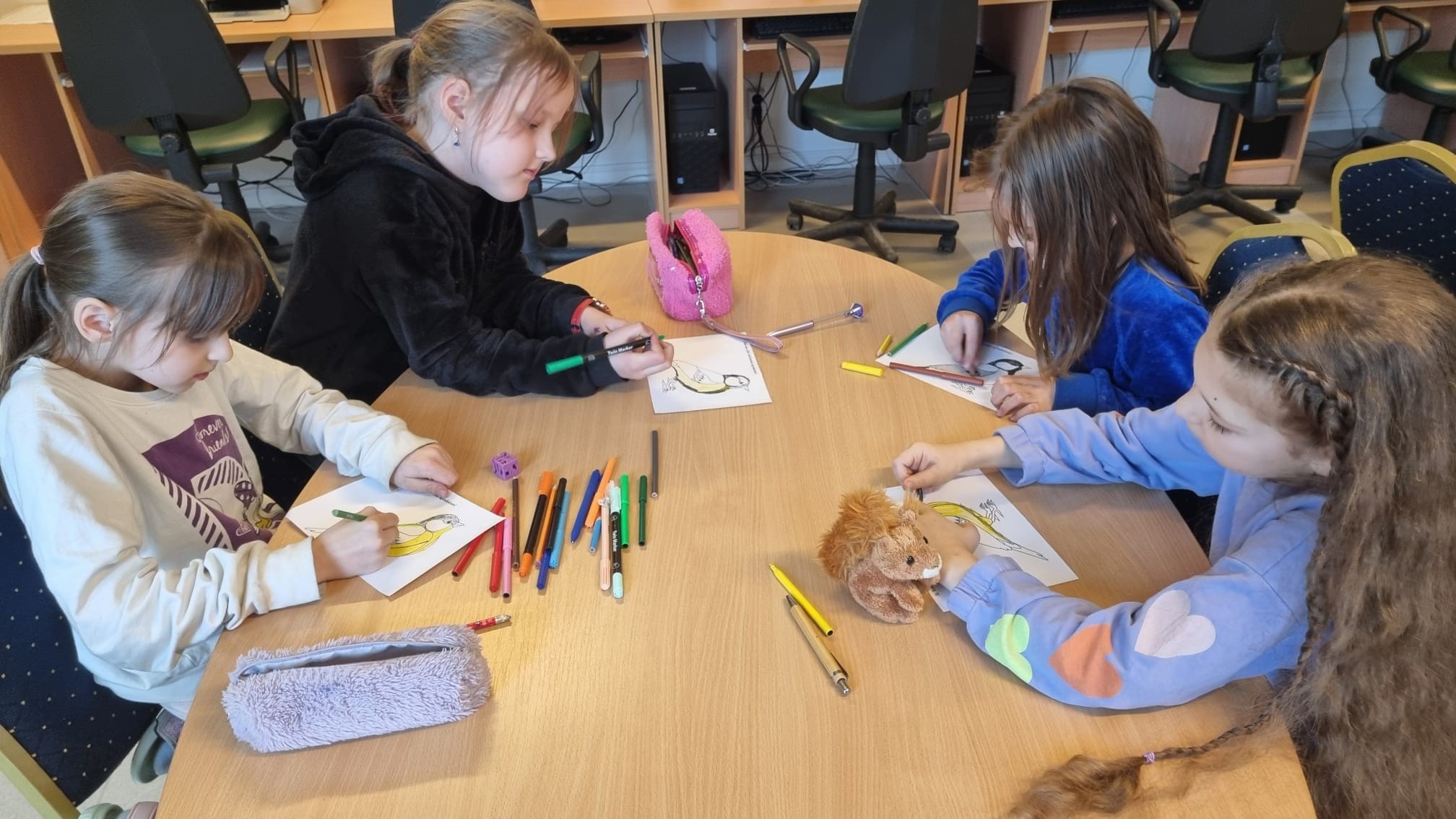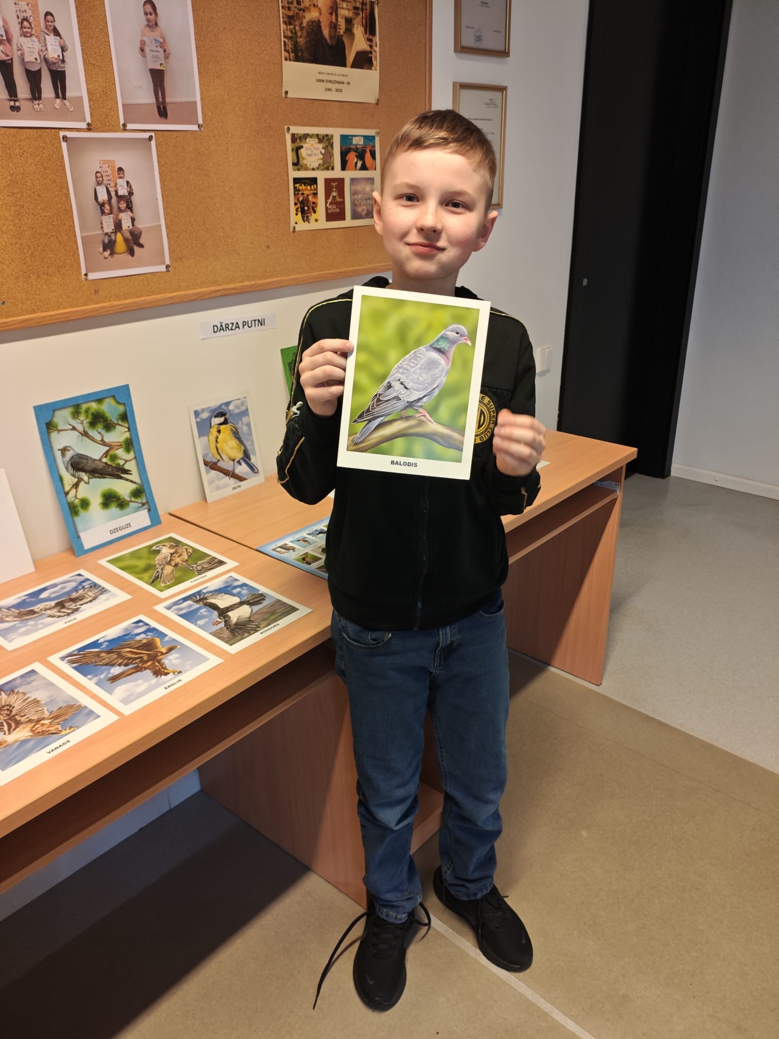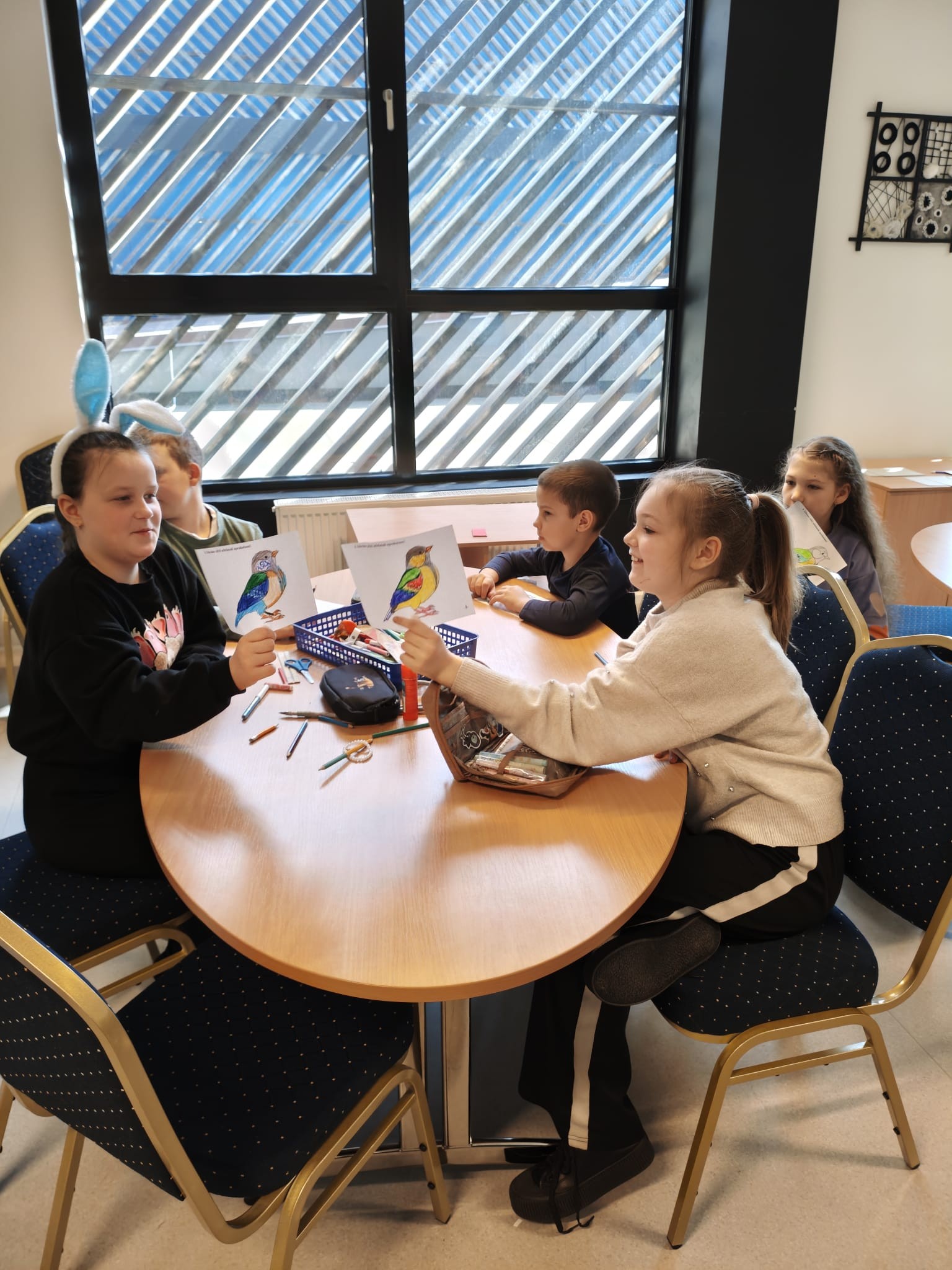 Nodarbības gaitā bērni iepazinās ar putnu, dzīvnieku, kukaiņu un augu dažādību, minēja burtu jūkli, pozitīvu emociju pilni zīmēja putnus pēc izlasītā apraksta.